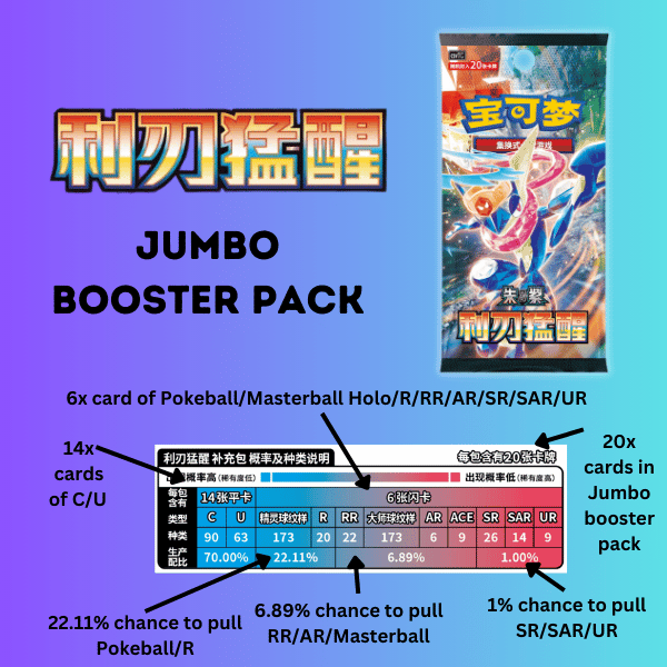Collector’s Tip: Jumbo Boxes have the chance of a “God Box”. That means each pack will contain a SR rarity and above in Every. Single. Pack!