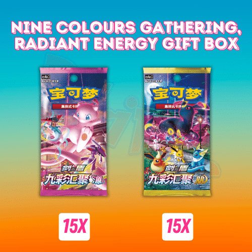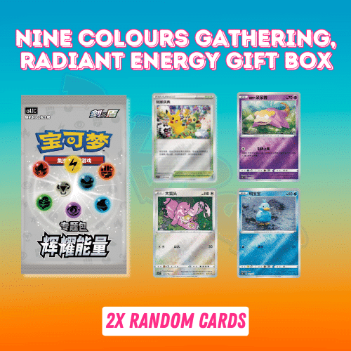 The Radiant Energy Gift Boxes, is specially crafted to commemorate the Nine Colors Gathering release in China. These exclusive collection boxes showcase beloved Pokemon such as Pikachu, Zacian, Zamazenta, and Eternatus. Each box has a chance to acquire a stunning Pikachu and Grookey Simplified Chinese promo card!